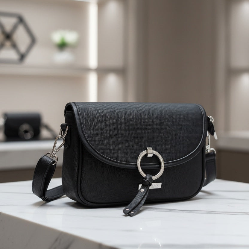 This bag fits any occasion. A fun brass metal O-ring hardware, on the flap grabs attention. It snaps shut with a stud. The main space zips and holds plenty. Inside, find one more zip pocket plus two slip pockets. A zip pocket sits on the back. The wide strap adjusts by buckle and pulls off.