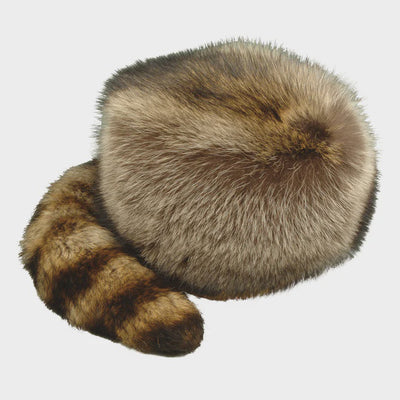 Stunning classic Davy Crockett Coonskin fur hat featuring a genuine raccoon tail that’s sure to catch attention, crafted from authentic recycled raccoon fur.