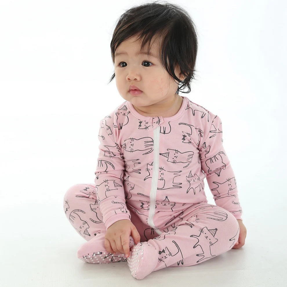 Silberry Baby Cat Print Bamboo Footies with Easy Dressing Zipper - Blossom