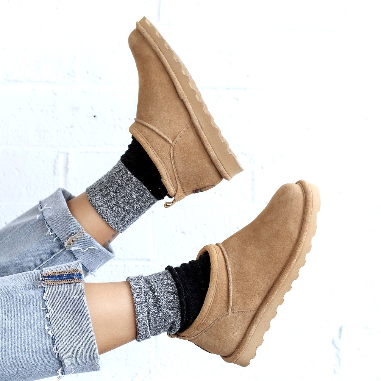 These super shorty suede ankle boots provide warmth and comfort without bulk, perfect for stylish fall and winter wear. Featuring a cozy wool blend lining, a removable comfort footbed, and BearCoat Rain & Stain Repellent, your feet will stay warm from early fall to snowy winter nights. They're easy to style and super comfortable — the ideal winter boot!