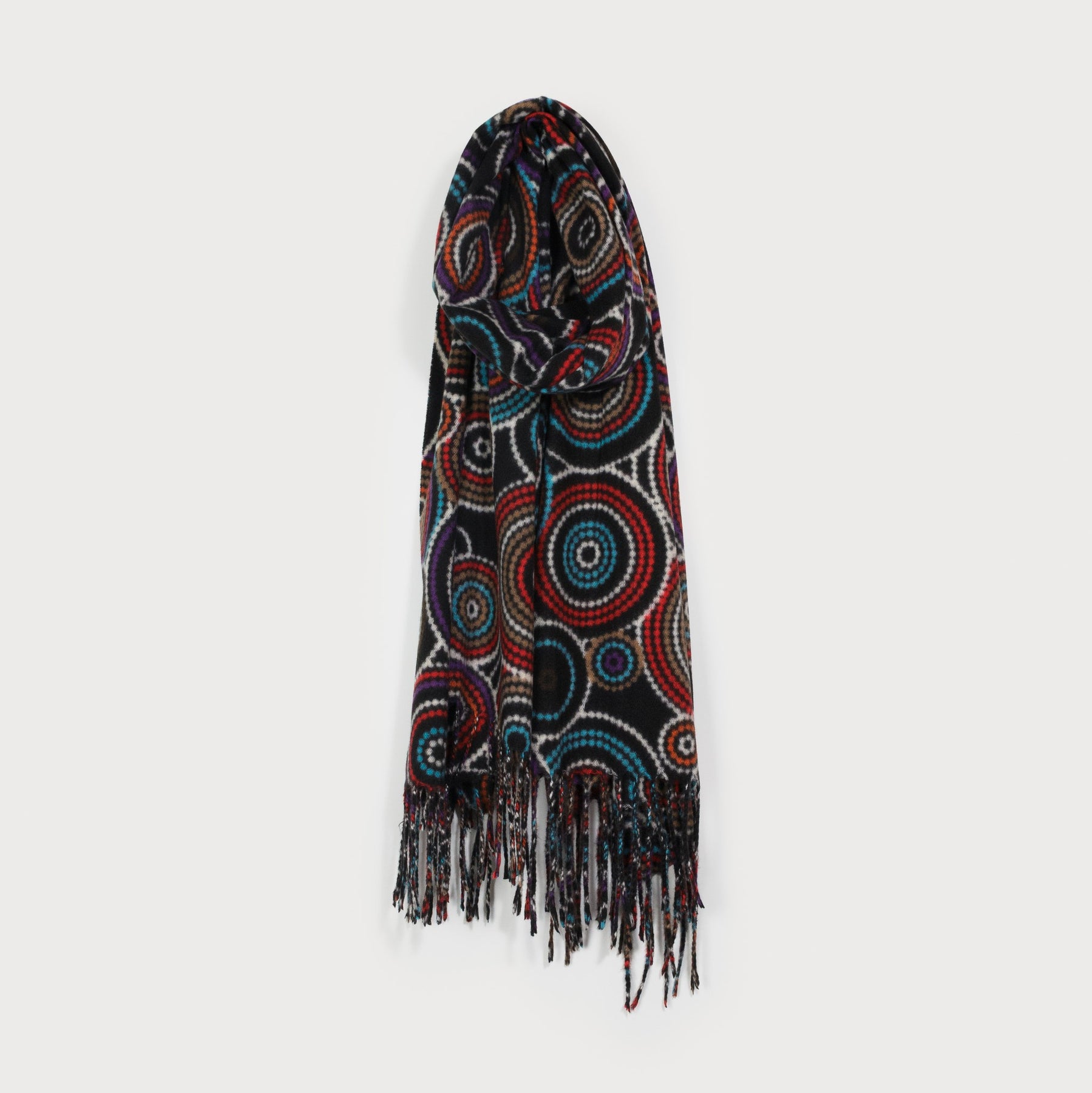 Get cozy with our geometric print scarf, a must-have that brings together heat, ease and style. Its big weave and geometric print give it an old-time feel, but one that works for now. What else? Thick enough to fend off the bitter winds, it can be wrapped around your neck or hung over your shoulders like a wrap. Its long fringes add the finishing touch to this cocoon of softness.