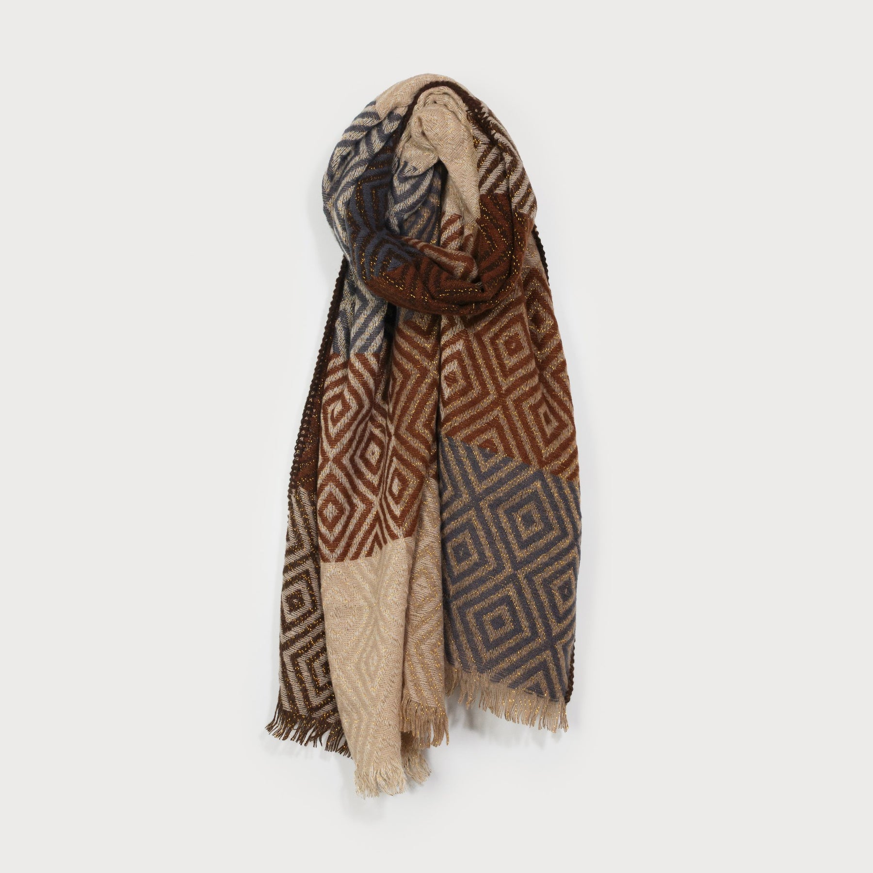 CARACOL UNISEX LARGE WARM & SOFT GEOMETRIC PRINT SCARF WITH LUREX INSERTION - BROWN, PURPLE