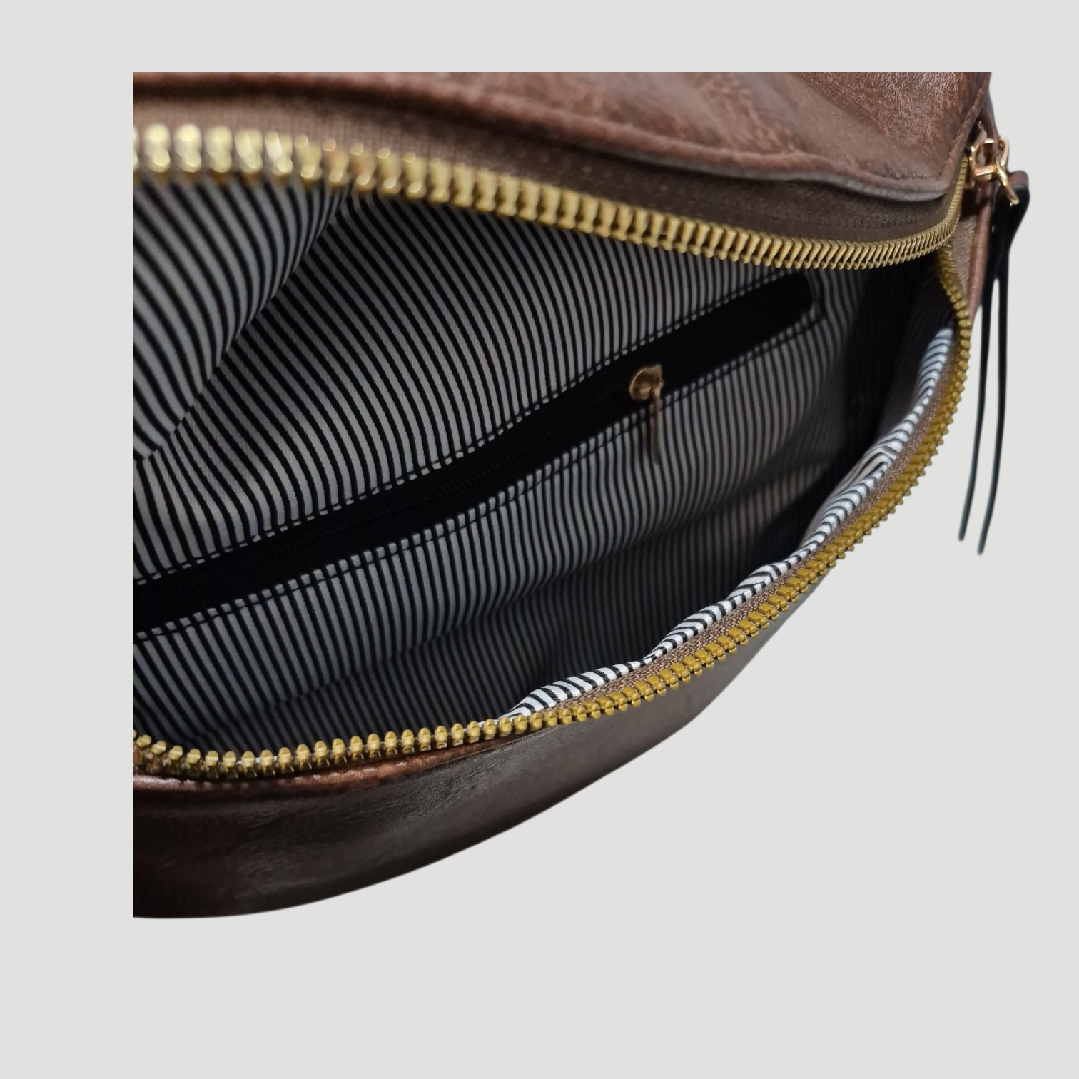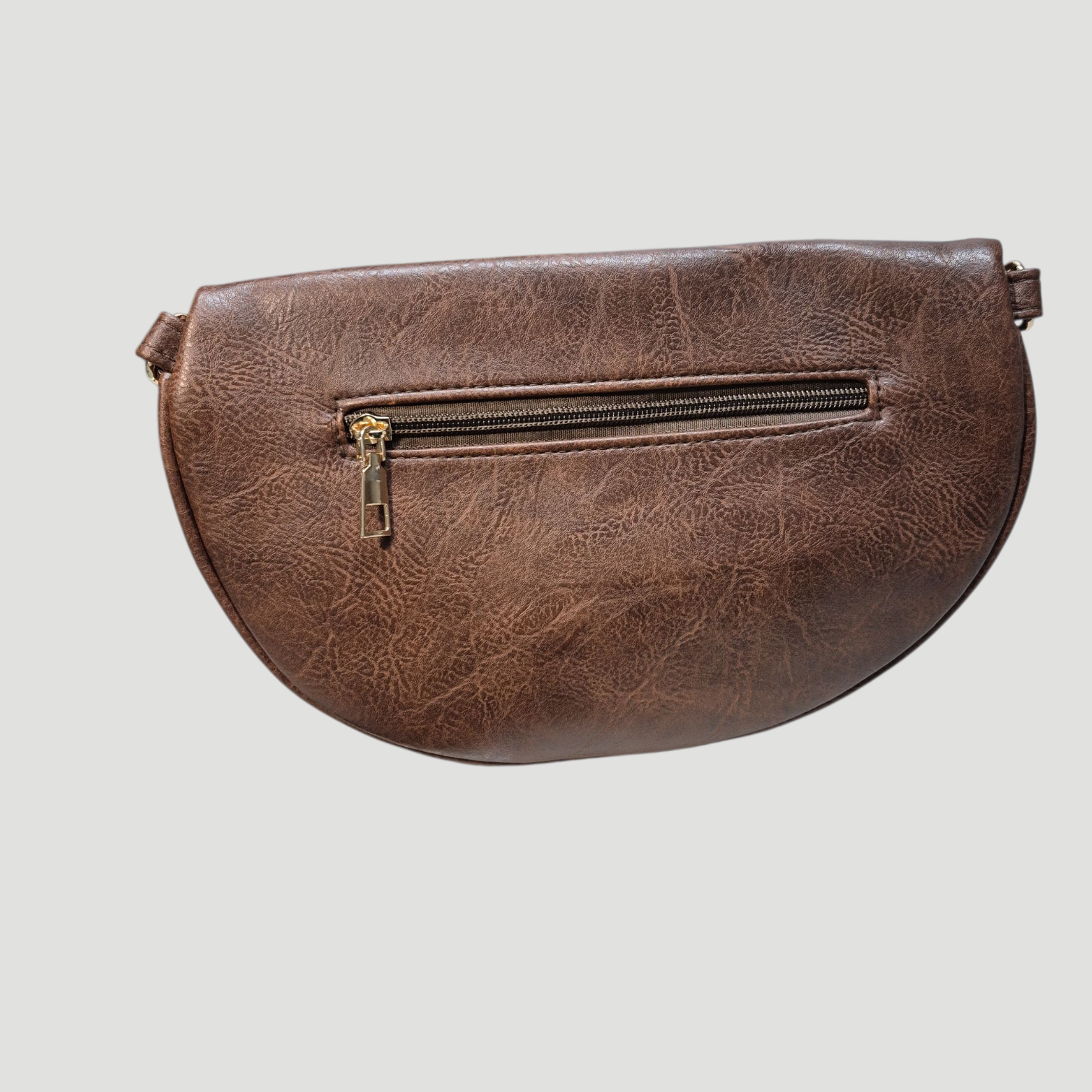 This chic women's semi-circle 2 in 1 crossbody hip bag from Caracol features premium, scratch-resistant Vegan leather that's soft and easy to maintain. Inside, a soft polyester lining safeguards your belongings. With a geometric strap and sturdy metal accents, it blends elegance with practicality, offering a spacious main compartment and a zippered back pocket.