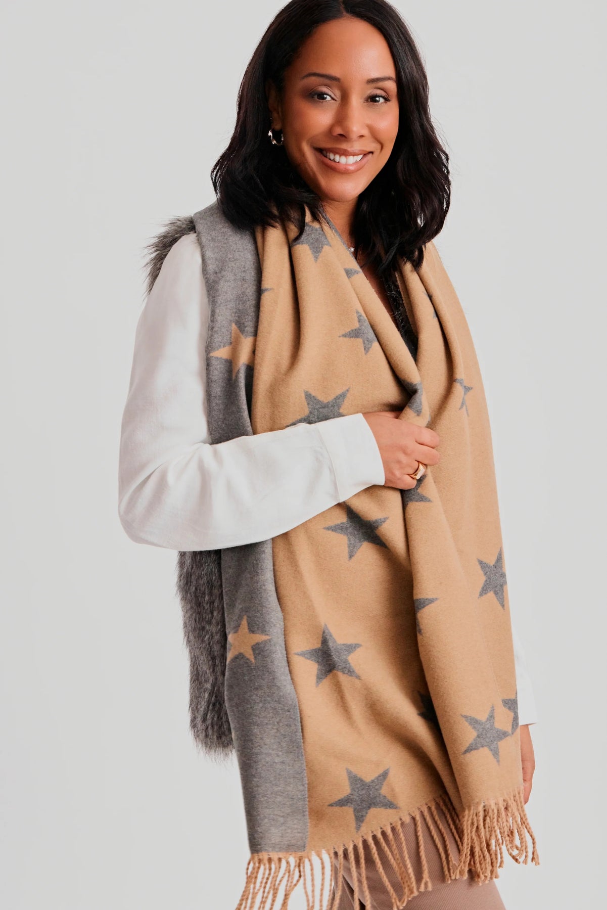 CARACOL UNISEX LARGE WARM & SOFT REVERSIBLE SCARF WITH STARS - TAN