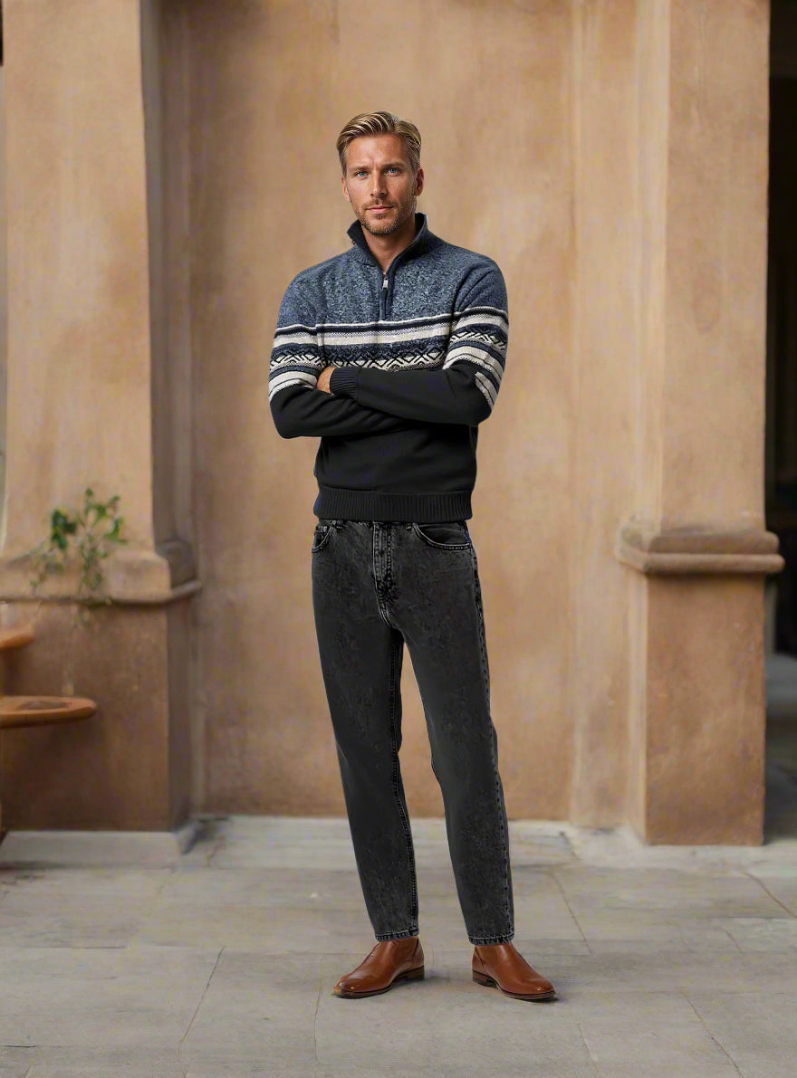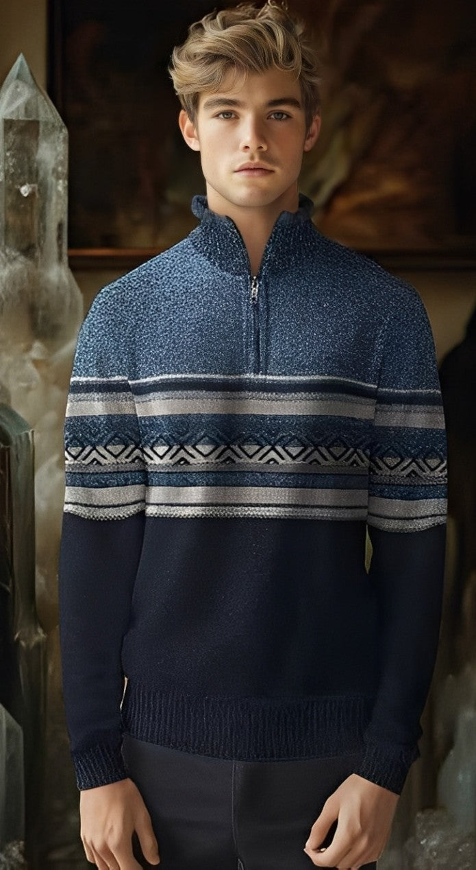Stay warm in style with this semi-fitted men's sweater featuring a classic 1/4 zip mock neck and eye-catching jacquard design. Made from 100% recycled polyester and lined with polar fleece for extra warmth and softness, it's ideal for layering in cold weather or casual wear, blending comfort, eco-friendliness, and style.