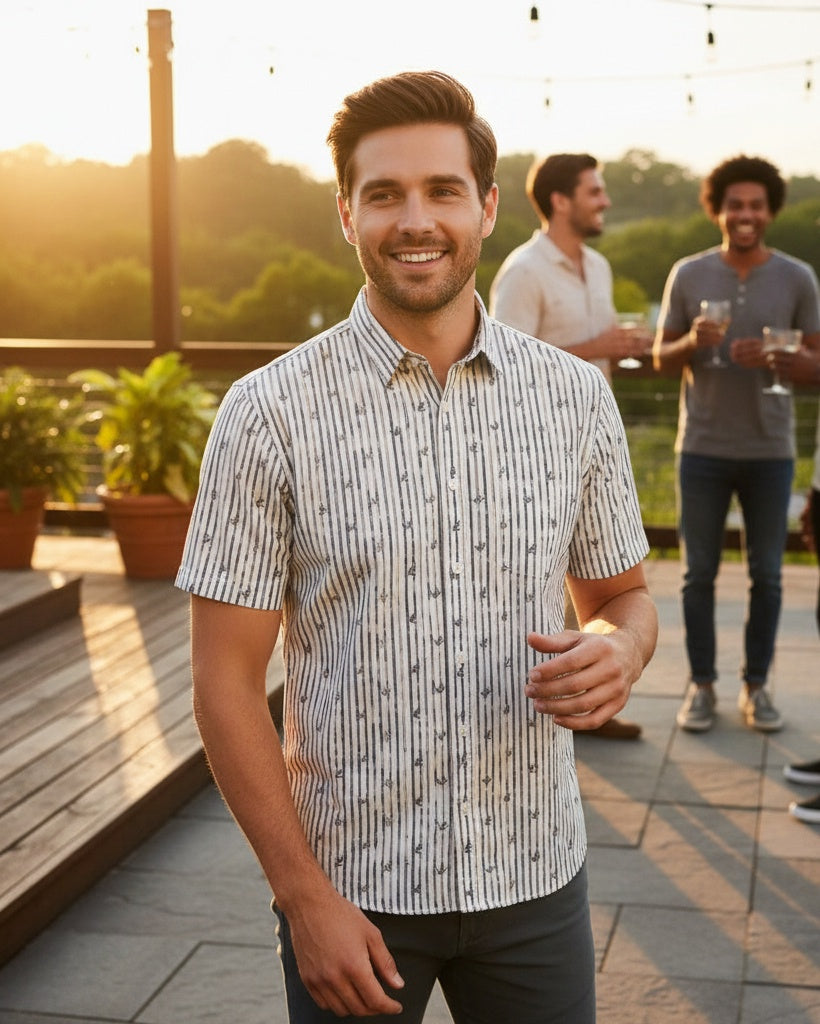 This short-sleeve shirt fits daily life with style and ease. Organic leaf motif print and light texture give it a fresh vibe for casual trips or warm days. Light stretch fabric moves freely and feels good all day. Simple care keeps it looking sharp, perfect for travel or routine wear. Semi-fit cut plus buttoned chest pocket blends loose comfort with a tidy shape.