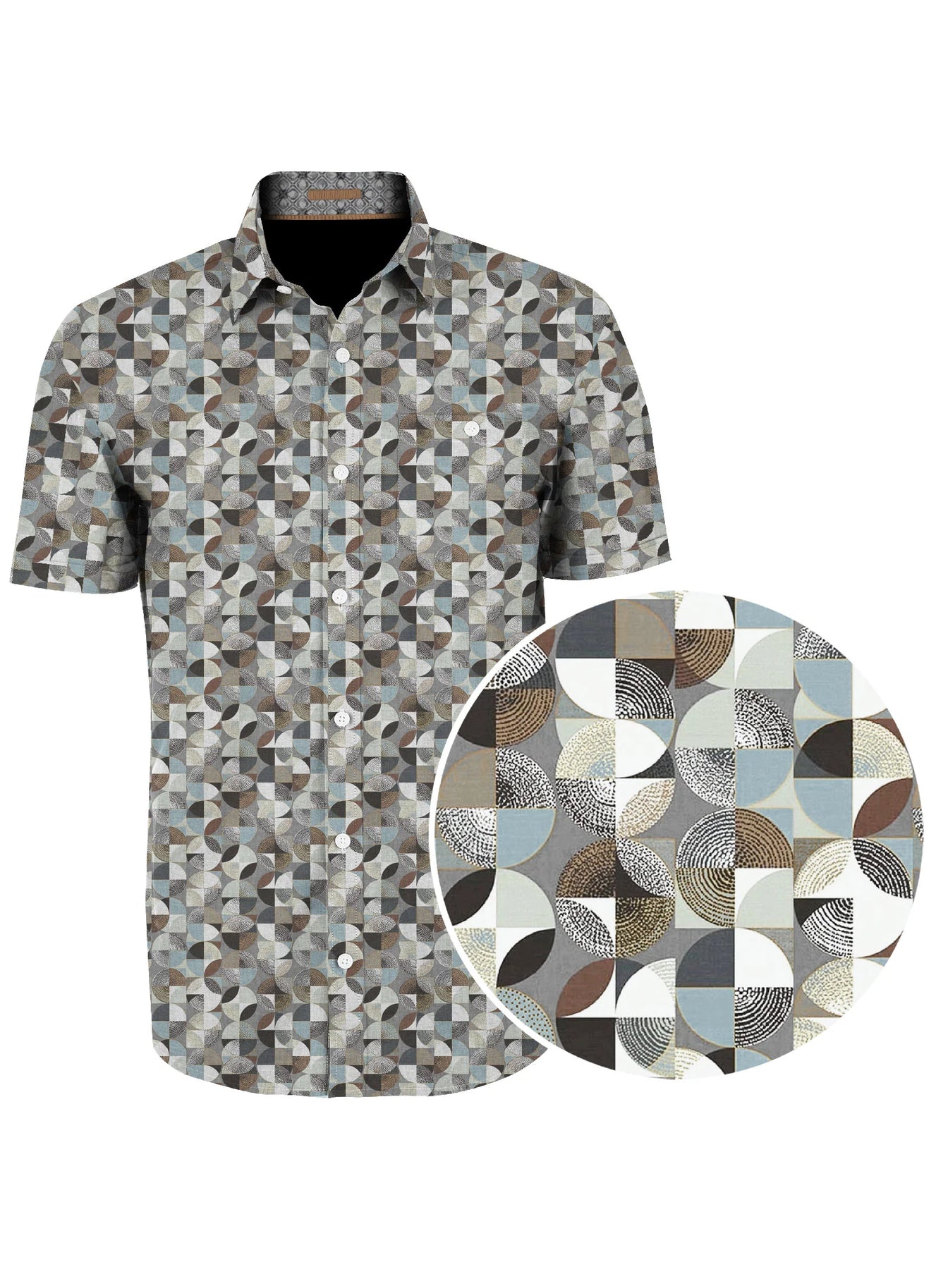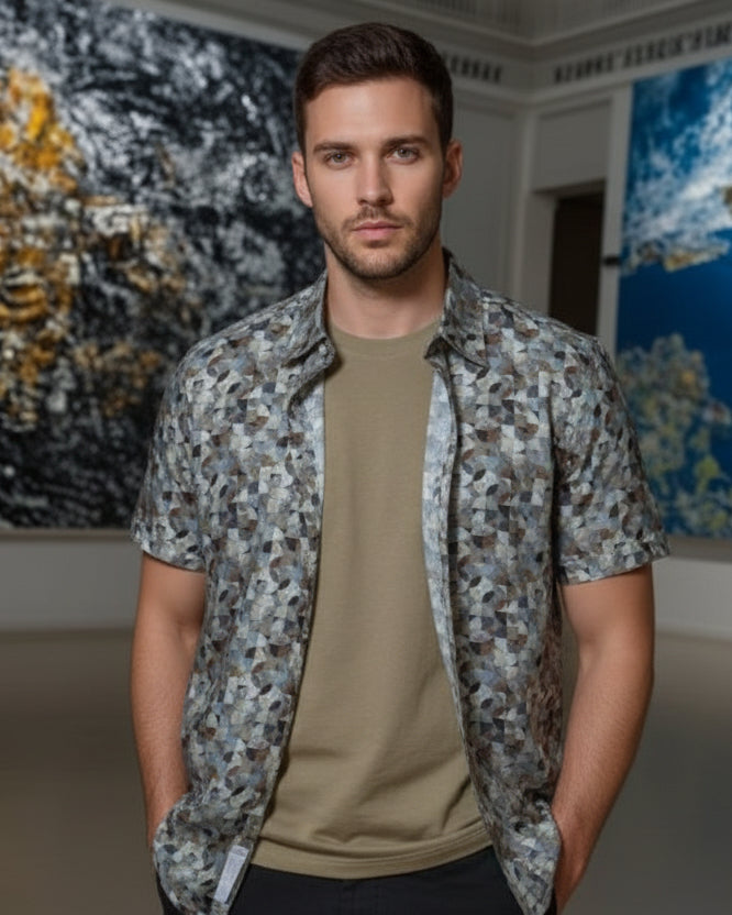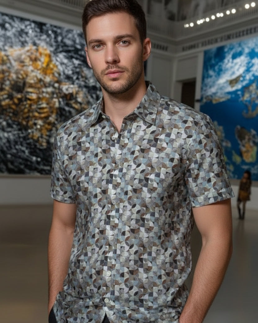 The BLAKE short-sleeve shirt sports a bold geometric print. It gives a sharp, modern vibe. Clean lines fit warm days well. Wear it casual or dressed up.