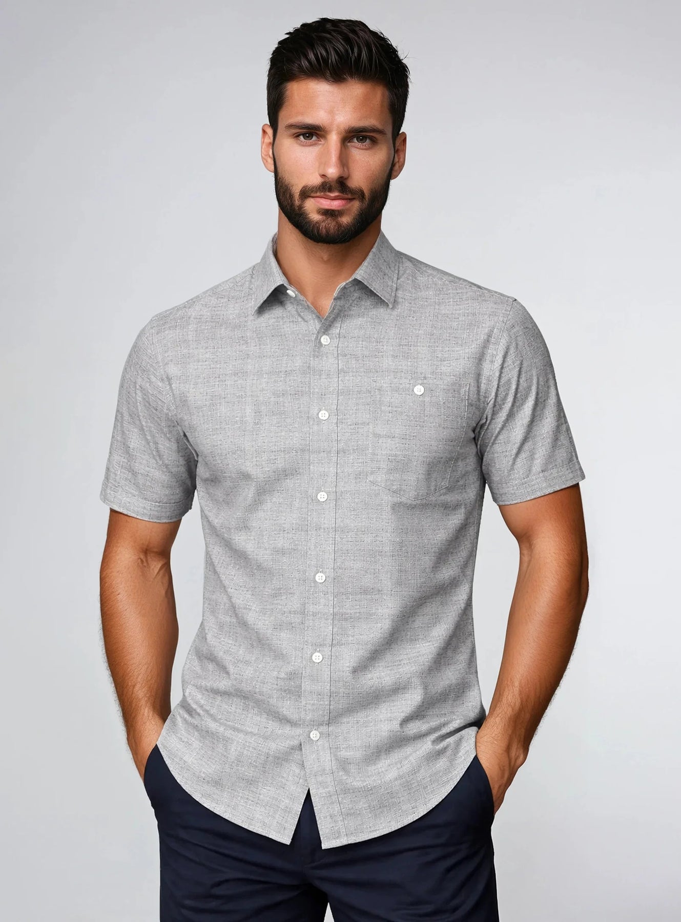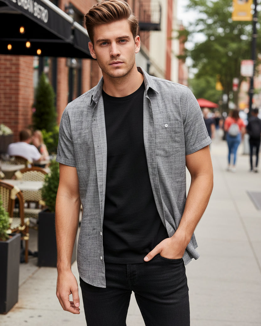 The MAXIME short-sleeve shirt fits comfort into travel and daily life. It blends solid performance with sharp style. A full texture print gives a fresh, modern edge. The look shifts smooth from trips to routine days.