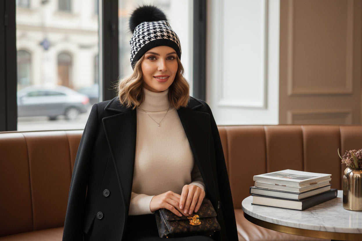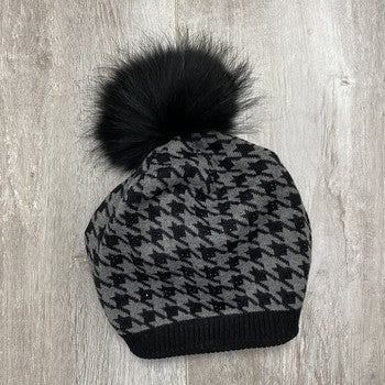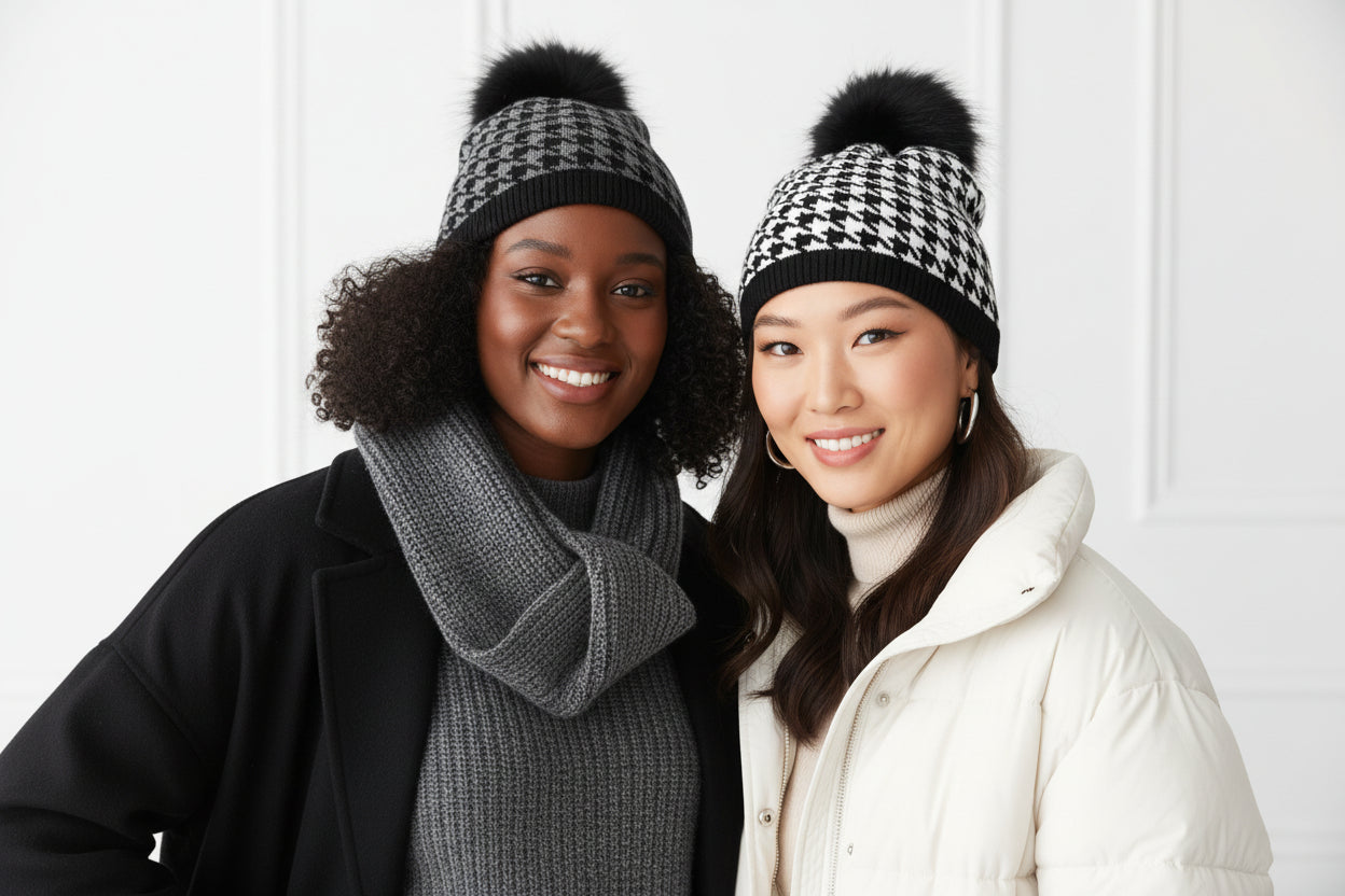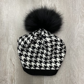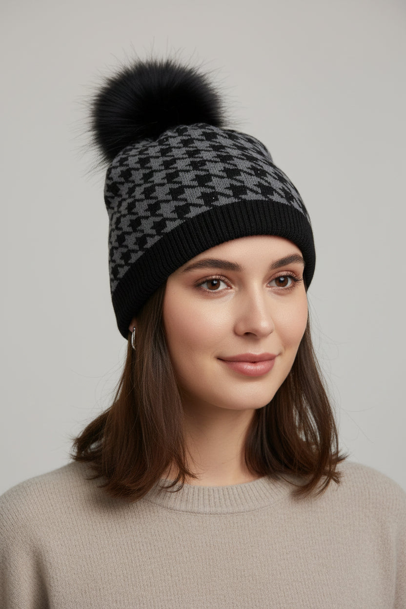 Discover the Houndstooth Hat—one of our best-selling classic beanie! With its slouchy design, it offers style and comfort for all head sizes. The removable real fur pom pom lets you customize your look, making it perfect for any occasion, from a night out to casual outings. The Beanie is your go-to accessory for winter adventures!