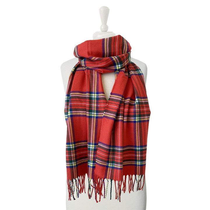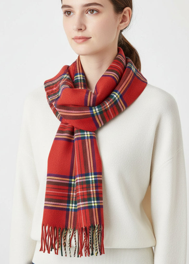 The Caracol red tartan plaid scarf stands out with its crisp plaid pattern and black, bright blue, yellow, and white accents. Soft wool hugs your neck on chilly December walks. Drape it loose over a coat, or knot it tight for wind.