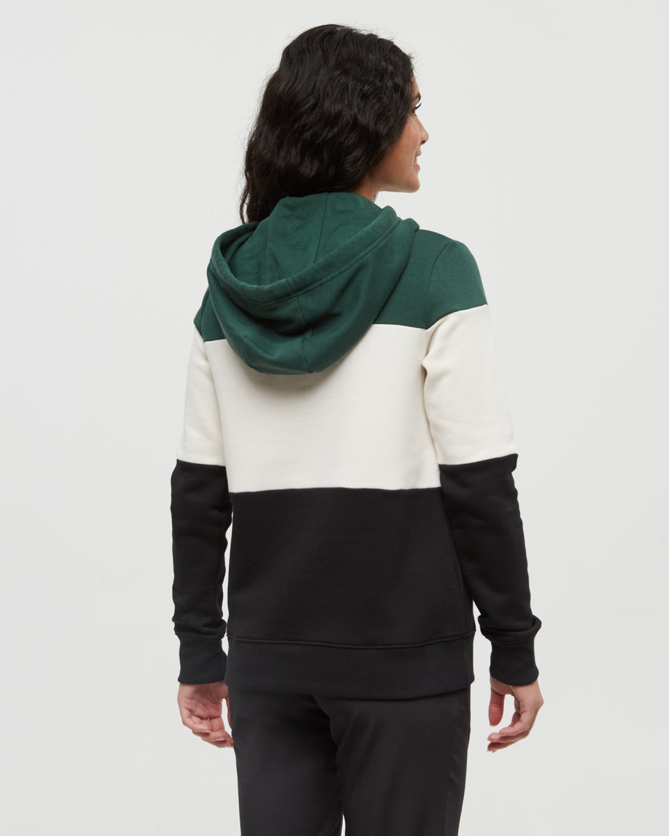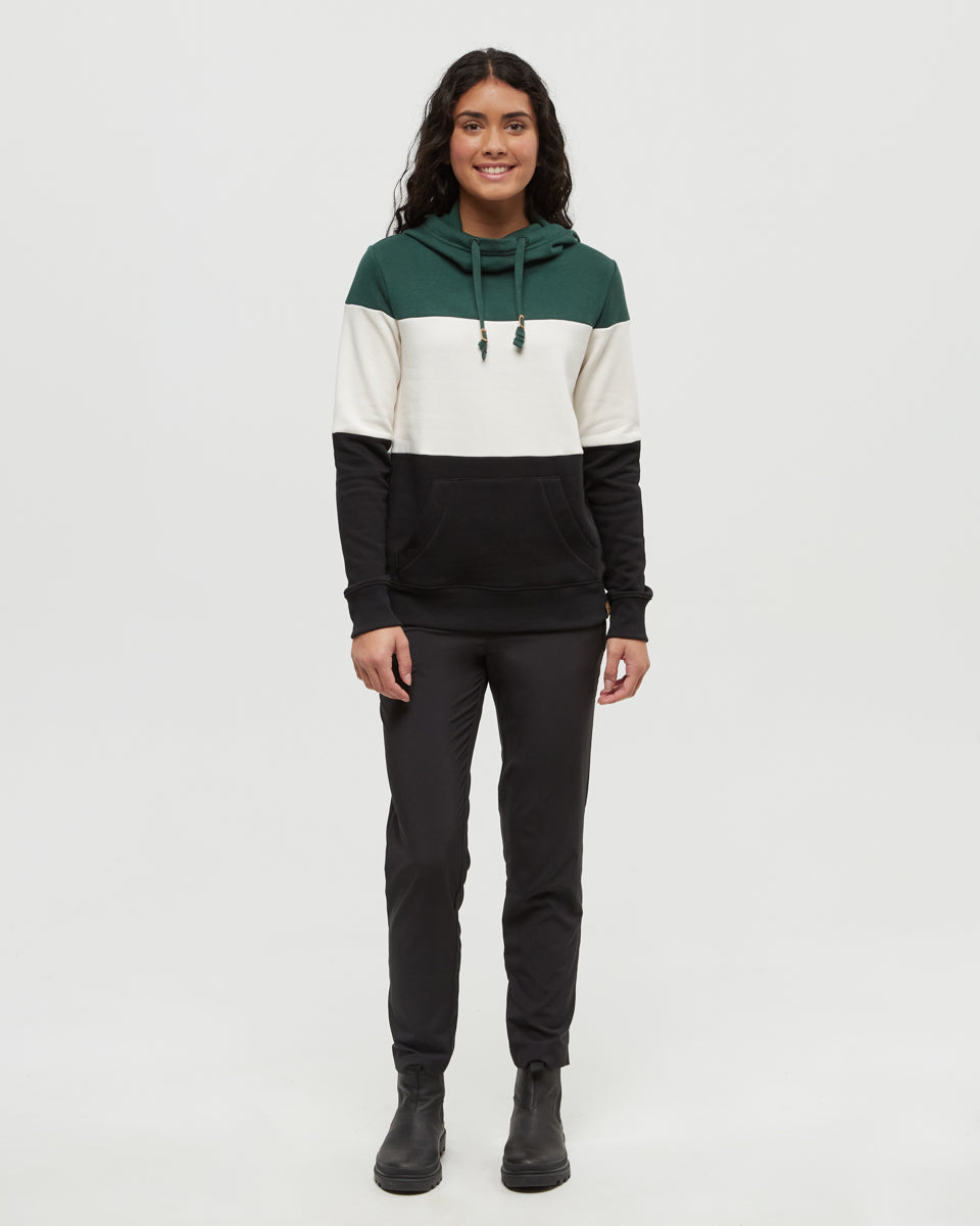 This comfy cowl neck blocked banshee hoodie is perfect for keeping you warm no matter where you are, whether it's on a mountain peak or chilling by the fireplace. It's crafted from a smart mix of organic cotton, recycled polyester, and TENCEL.