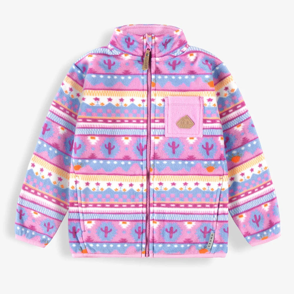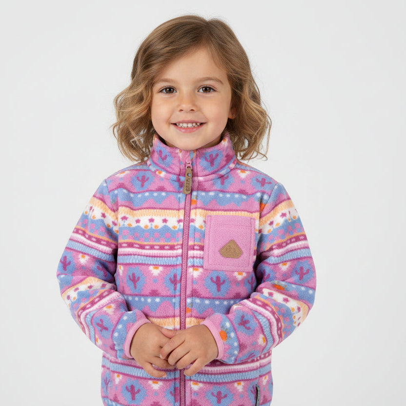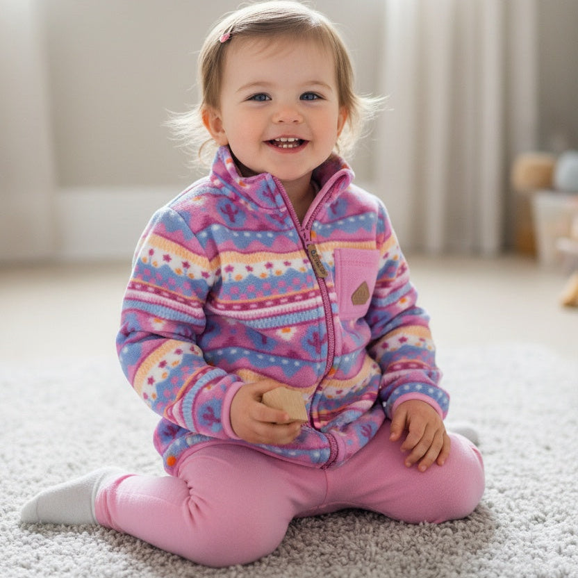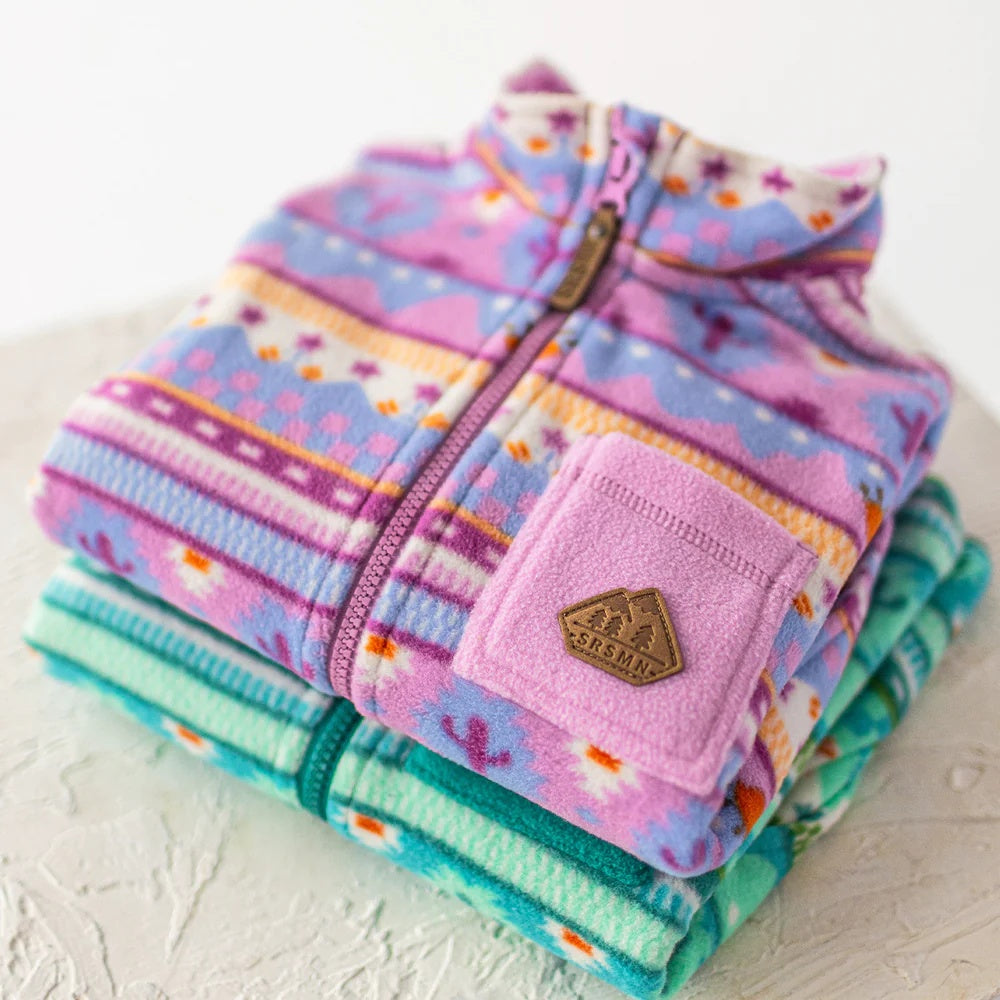 This purple fleece jacket sports fun patterns. It's great for cold days. A high collar keeps wind out. The zipper has a chin guard. It includes one front pocket and two side ones. Layer it under a coat for extra warmth. Adults and kids can wear matching versions.