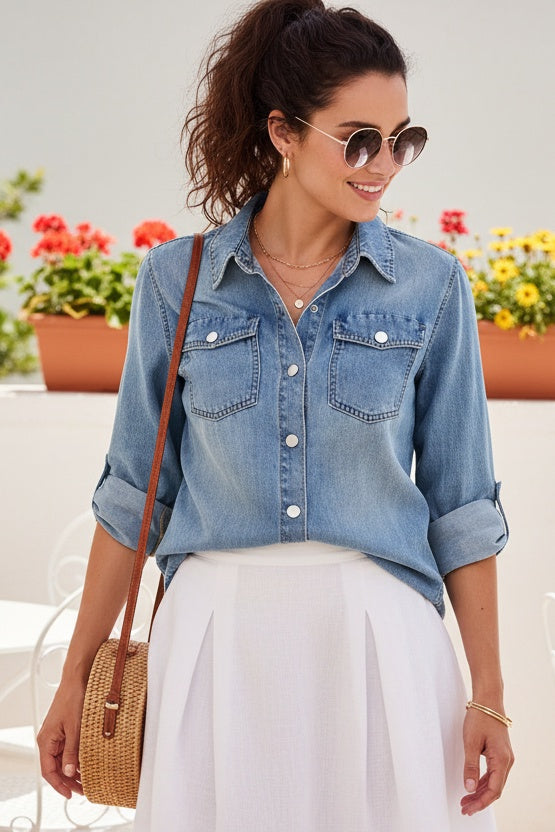 Enhance your wardrobe with this timeless denim shirt, designed with roll-up sleeves for added versatility. Made from lightweight, non-stretch denim, its relaxed fit and sharp lines make it ideal for layering or wearing on its own, ensuring effortless spring style year after year.