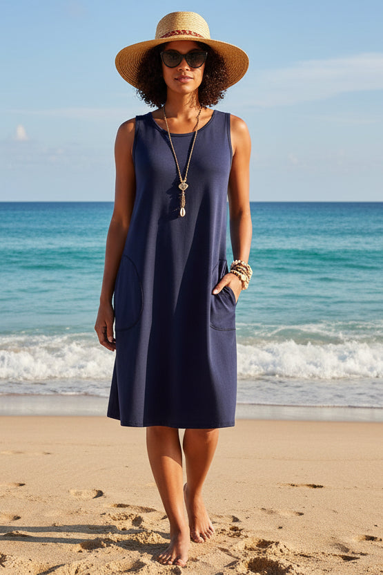 Expand your wardrobe options with this adaptable piece! This sleeveless bonded knit dress is reversible, making it an ideal travel buddy, especially for those tiny weekend getaway bags. One side features a solid black that can be super laid-back or dressed up effortlessly, while the other side turns into a tropical treat.