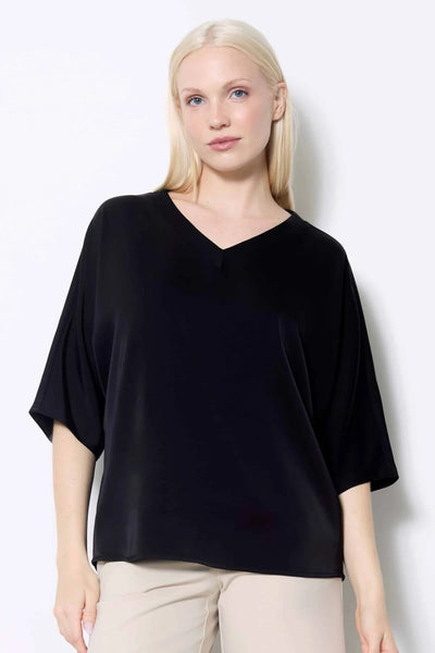 UP! WOMEN'S SOLID BELIZE SATIN V-NECK T-SHIRT - BLACK