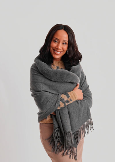 Caracol Women's Lightweight Shawl with Faux Fur Collar and Fringes - Grey, Black