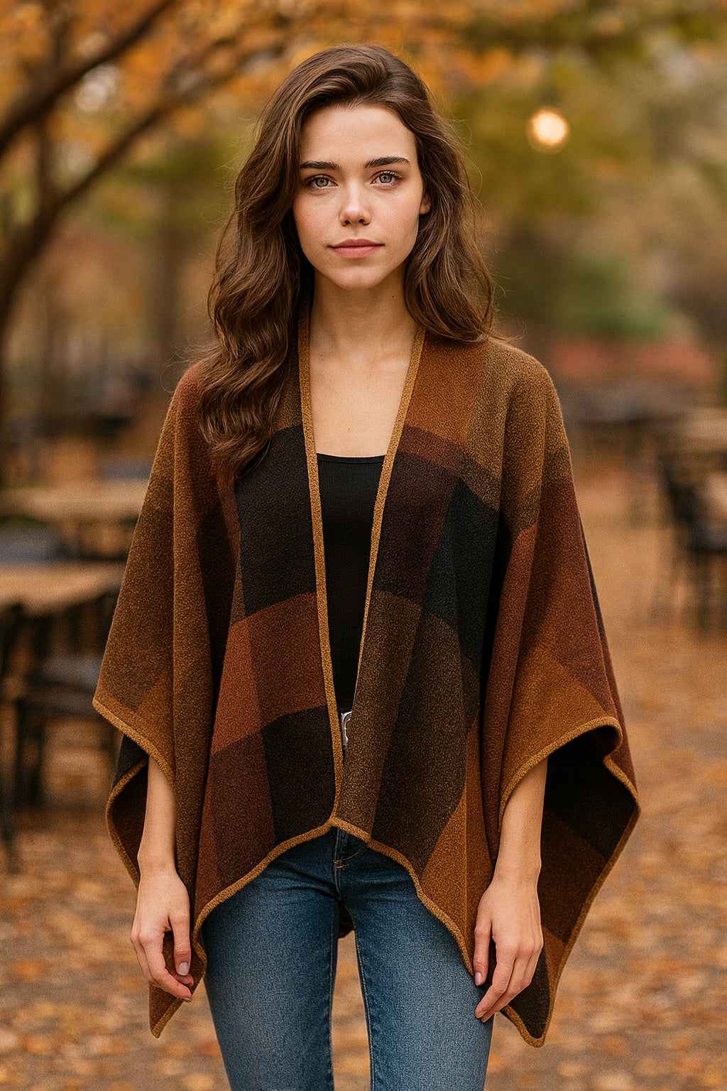 This women's poncho cape comes from top-notch fabric that's gentle on skin and feels just like cashmere. It stays soft and toasty. Wear it as a shawl, cardigan, blanket, scarf, jacket, cloak, wrap, or cape—whatever suits the day. The big wrap shows off color blocks and fun patterns. A simple blanket stitch finishes the edges.