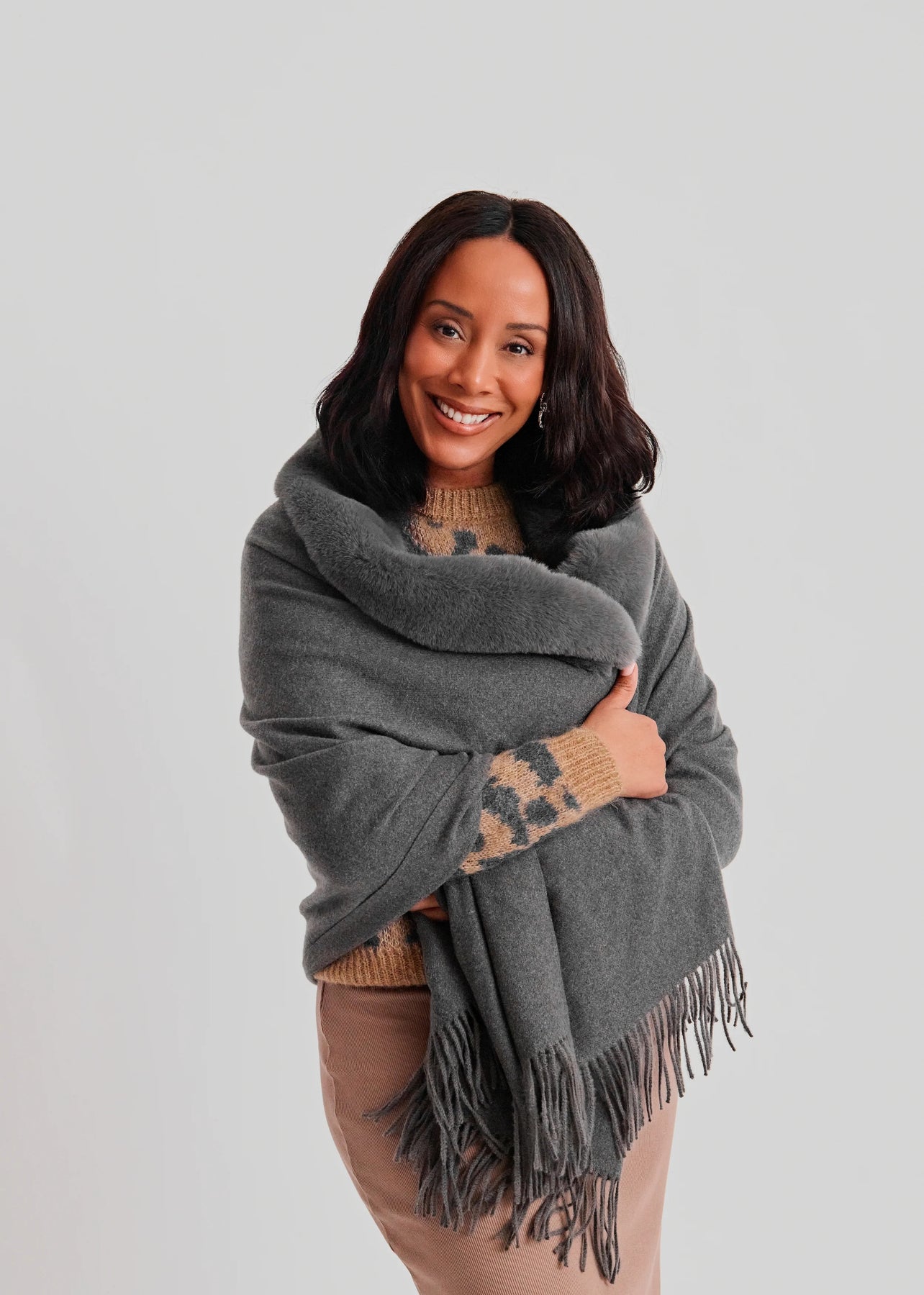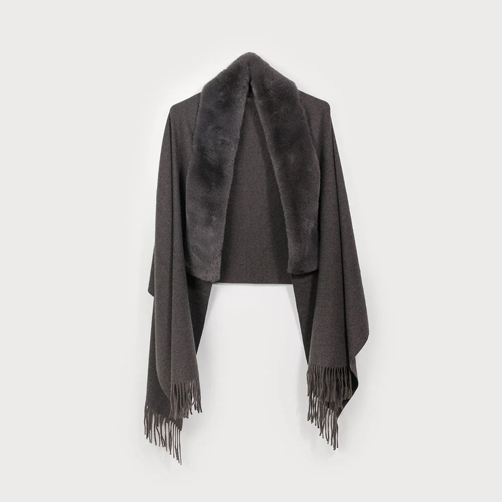 Snuggle up in style and elegance with this beautiful shawl that has a stylish fox fur collar. It's the ideal mix of fashion and coziness for those chilly months!