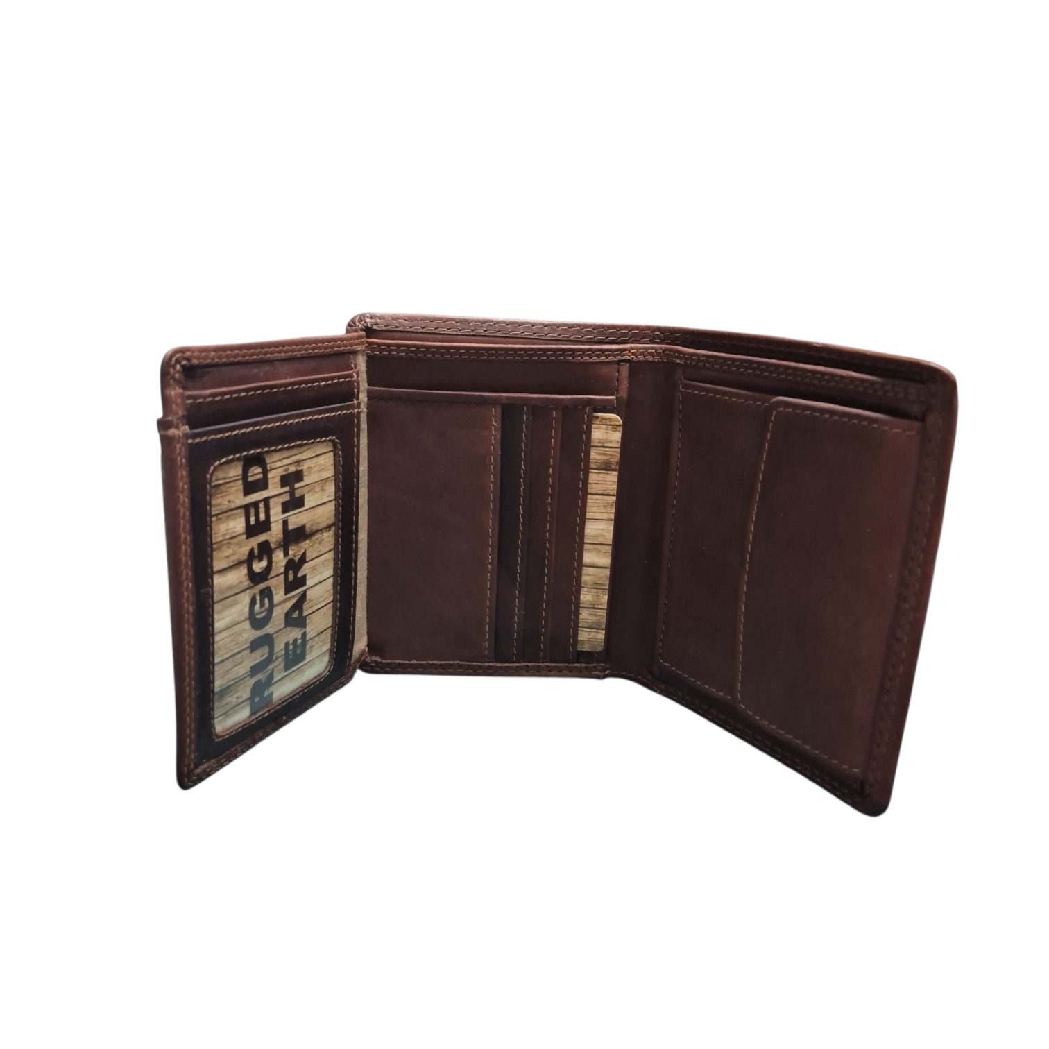 The Rugged Earth Slim Leather Wallet makes a great pick for busy guys who need something practical. It's made from top-notch, all-natural vegetable-tanned leather that looks sharp and holds up well over time. The slim shape fits right into tight spots, such as the inside pocket of a suit. Double-stitched edges and smooth rounded corners add extra strength, so it stays tough against daily use. This wallet features a classic bifold design with modern touches for organization. It includes a window ID , a flip-over card slots and a coin pocket and while the genuine leather molds to your style over time. Plus, it has a split bill section to separate large and small bills.