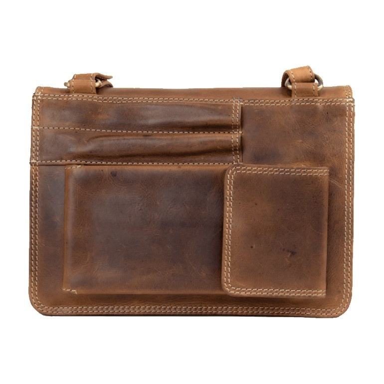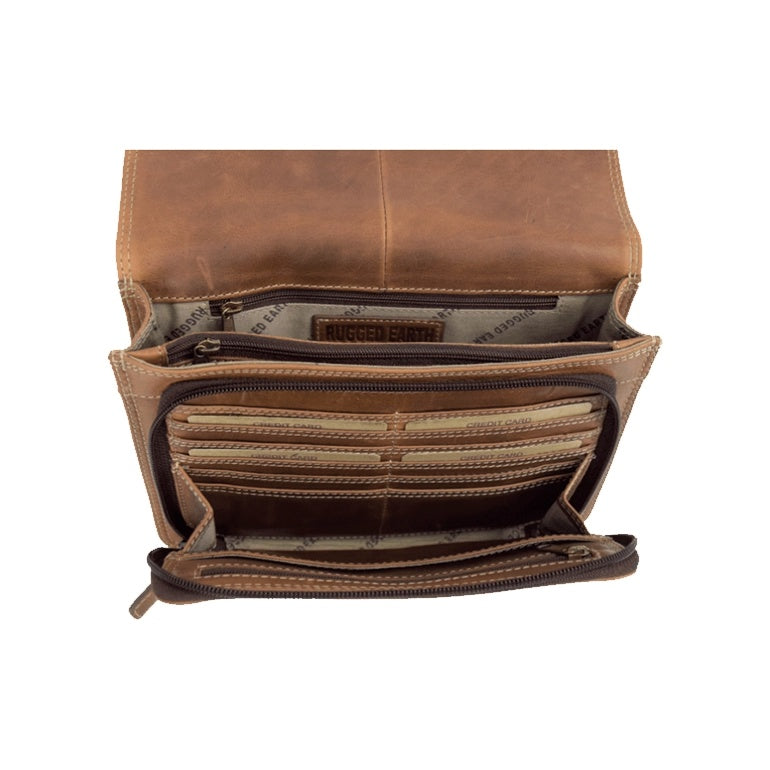 The Rugged Earth Leather Organizer Purse fits busy women who need a tough bag. It uses strong, natural vegetable-tanned leather that looks good and lasts. Double stitches and smooth corners handle daily wear well. A snap flap covers the front. Inside sit two zip pockets and a middle zip divider. One zip spot holds 12 cards and cash. The back side has room for a phone or glasses, plus pen loops. The strap adjusts from 33.5 to 66 inches.