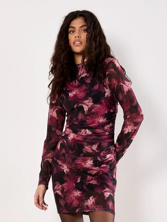 This dress features a floral print and a snug fit. Made from soft mesh and lined for comfort, it has long sleeves and a ruched side that enhances your shape. Pair this bodycon dress with heels to finish off your outfit.