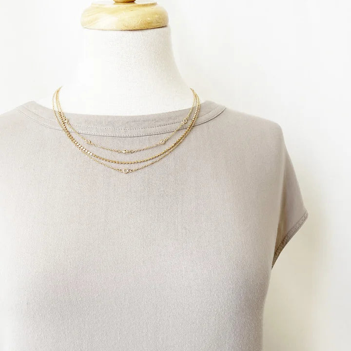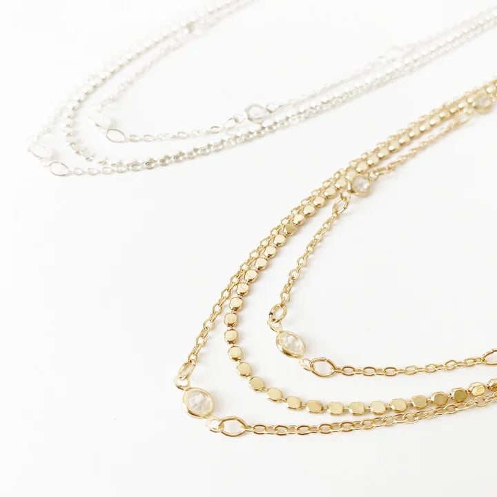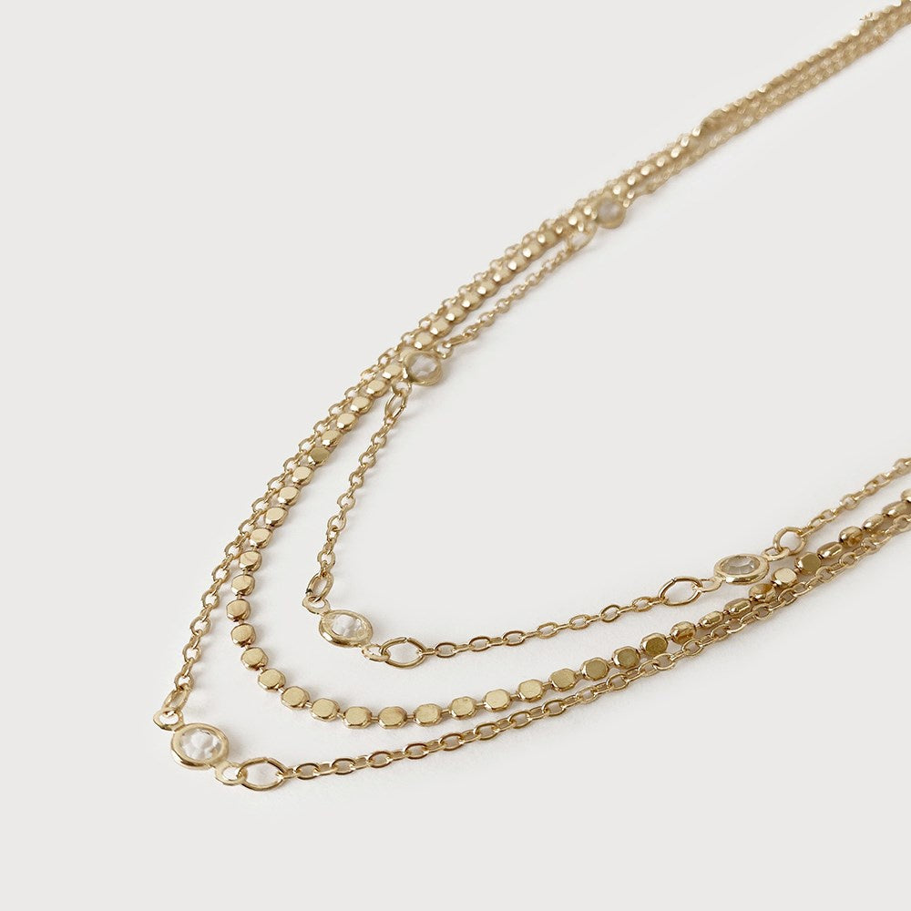 Caracol women's layered gold necklaces sparkle in this close-up shot. Delicate coin links chain together lightly. Clear circular gemstones nestle between them. Gold gleams soft and bright. Layers drape with easy grace.