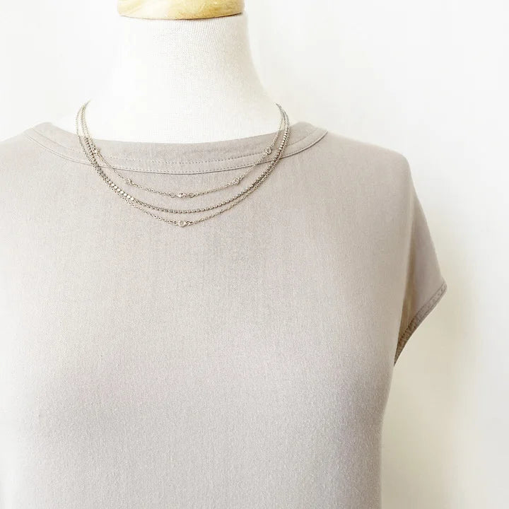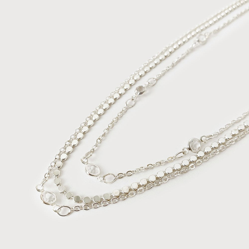 Caracol women's layered silver necklaces sparkle in this close-up shot. Delicate coin links chain together lightly. Clear circular gemstones nestle between them. Silver gleams soft and bright. Layers drape with easy grace.