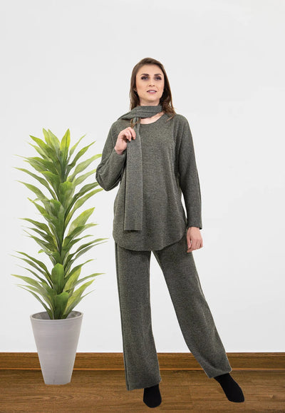 Cherish Women's Knit Top with Matching Scarf and Necklace- Olive Green