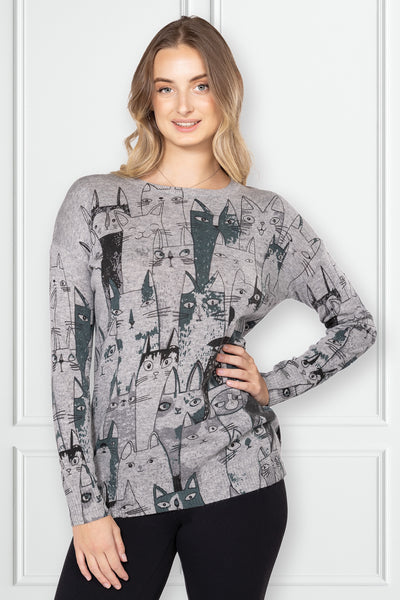 Variations Women’s Round Neck Cat Print Sweater - Grey