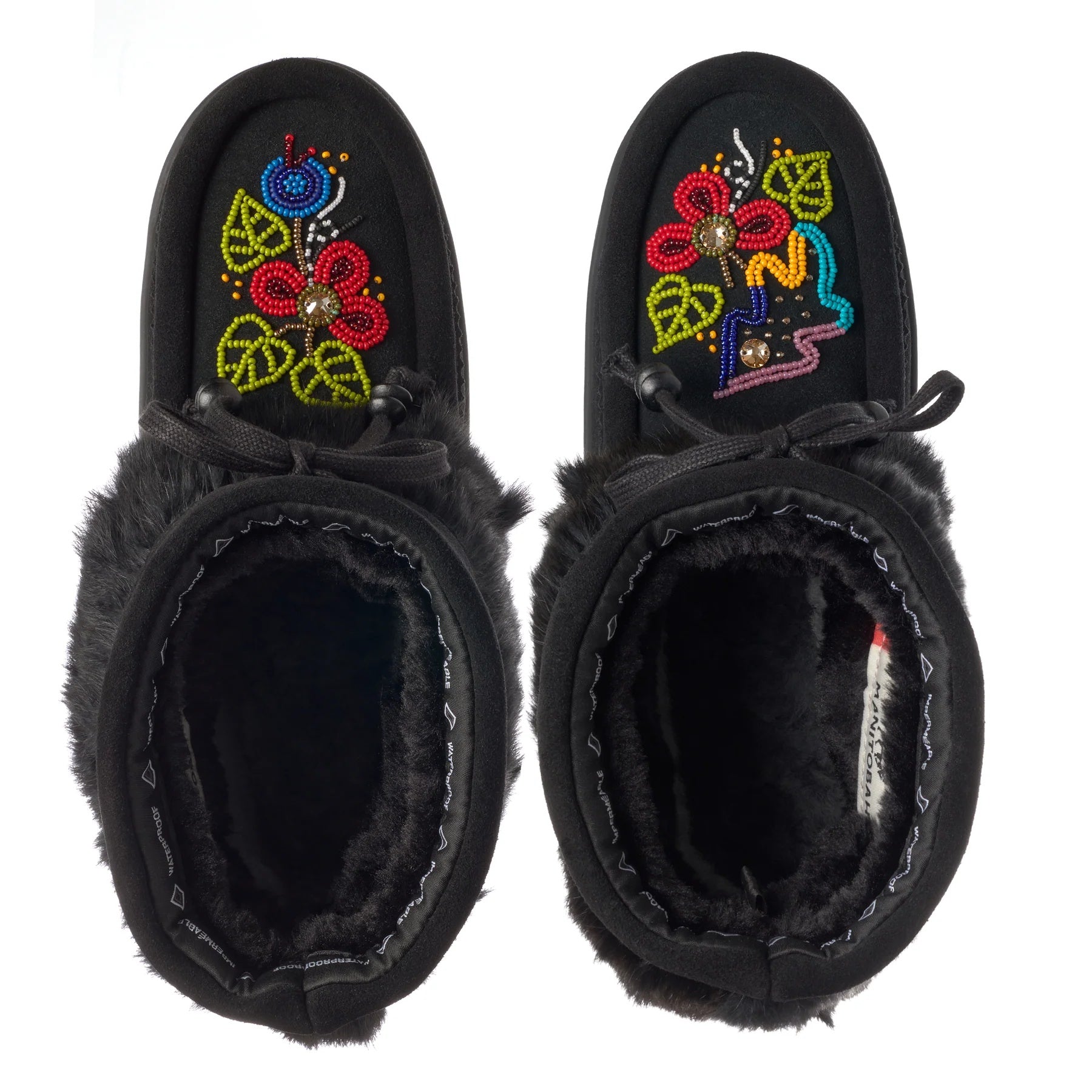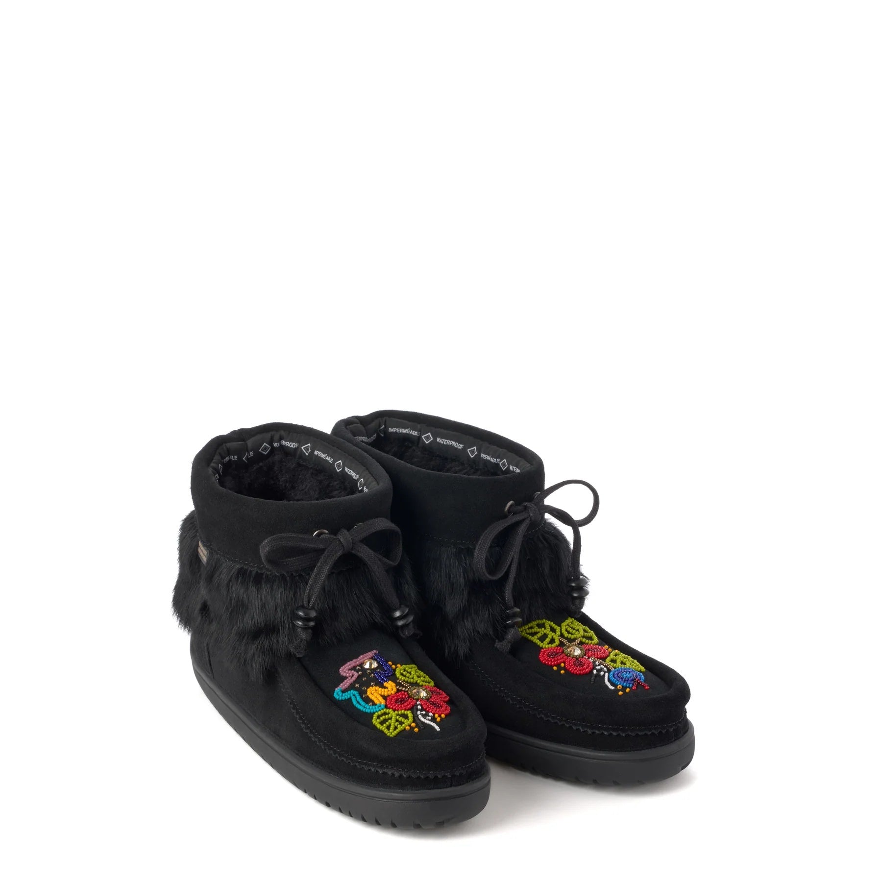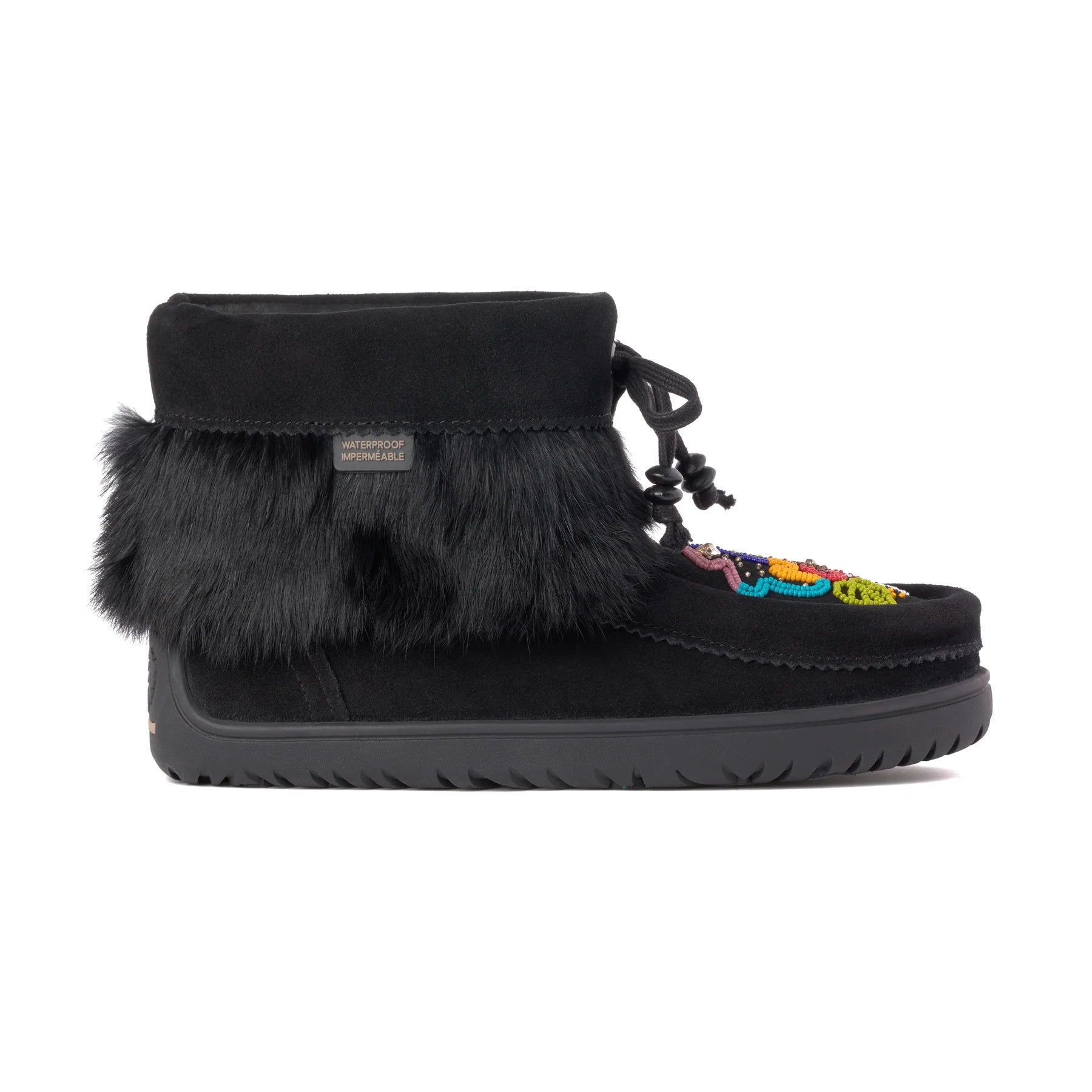 The Waterproof Walking in Two Worlds Ankle Mukluk is a 6-inch boot based on a classic mukluk design. It uses waterproof suede with soft rabbit fur trim. Inside, you get a cozy fleece lining and a plush shearling footbed, plus an adjustable fit. This shorter style works well for daily wear. Artist Heather Dickson, who is Inland Tlingit and Tagish from the Carcross Tagish First Nation and Nuxalk from Bella Coola, BC, added beadwork. Her design includes seaweed patterns, Bella Coola Blue colors, and turquoise beads to show her inland and coastal ties. The boot handles cold down to -32°C. Its Glacier Grip sole gives good traction on ice and snow. Overall, it blends cultural touches, comfort, and strong winter use.